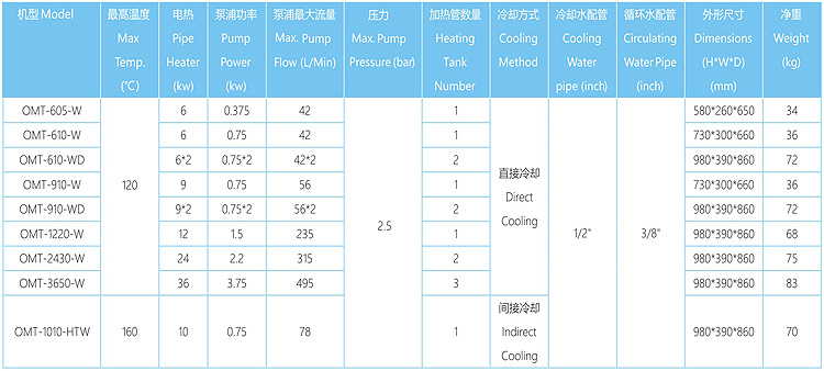7. OMT-W標(biāo)準(zhǔn)型采用直接冷卻方式,OMT-HTW高溫型采用間接冷卻方式,自動(dòng)直接補(bǔ)水裝置,可快速降溫。