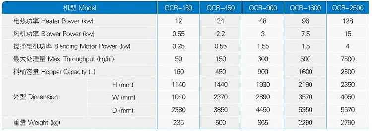 OCR系列密閉循環(huán)干燥結晶機用于持續(xù)結晶非晶化材料,將尚未晶化的PET原料或回收料結晶成可以直接除濕干燥的結晶原料。該系統(tǒng)包括加熱裝置,保溫料桶 及攪拌組件。當未晶相化的PET原料或粉碎料進入料斗后,對其進行結晶處理,同時進行攪拌,可防止原料結塊并降低產品不良率。結晶后的塑膠可以從料斗底部 輸送到儲料桶或直接輸送至干燥料桶中干燥后使用。