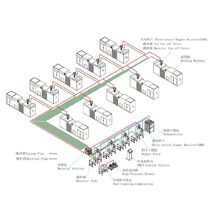 集中供料系統(tǒng)作為注塑車間不可缺少的一部分,可以有效的解決供料和自動(dòng)分配比例的難度,可實(shí)現(xiàn)將多種原料自動(dòng)供給任意的單機(jī)使用,主要包括原料的干燥處理,配色處理,物料回收料利用,可以對(duì)原料的整個(gè)輸送過(guò)程實(shí)行高度的監(jiān)測(cè)和自動(dòng)化控制,并能滿足24小時(shí)不停機(jī)的生產(chǎn)需要。